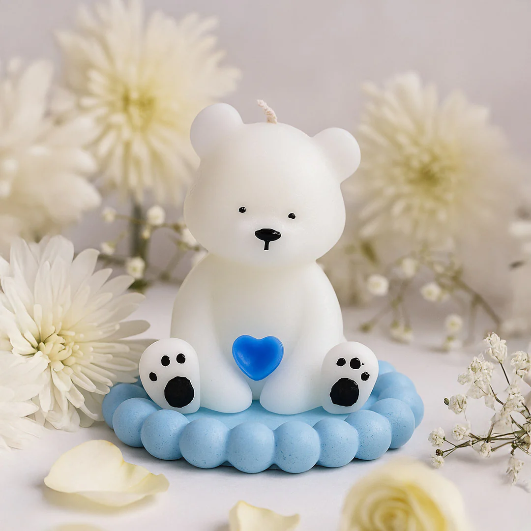 This Teddy Bear Candle with Bubble Base is a charming decorative piece crafted from eco-friendly soy wax. Designed as an adorable white polar bear holding a blue heart, it sits gracefully on a light blue bubble platform that adds a playful touch. Each candle is hand-poured with care, making it unique and premium in quality. With its soothing white and blue aesthetic, it serves as a delightful accent for home décor while being completely vegan, smoke-free, and safe for indoor use. Perfect as a baby shower gift, birthday return gift, anniversary present, or even as a cute desk accessory, this pre-made design is ready to impress without the need for customization.