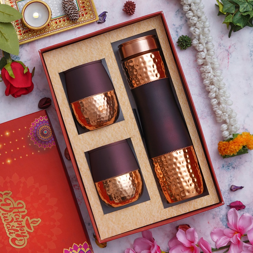 Get specially crafted traditional copper combo offering numerous health benefits. The hamper includes Copper bottle of 1 litre and 2 copper glasses set, 100% pure handcrafted from copper. It combines traditional health benefits with modern aesthetics. Drinking from copper bottle boost metabolism, has antimicrobial properties killing bacteria, helps reduce fine lines, wrinkles and slows aging. It also regulated thyroid function, combats arthritis and anemia. Perfect for personal use and gifting purposes.