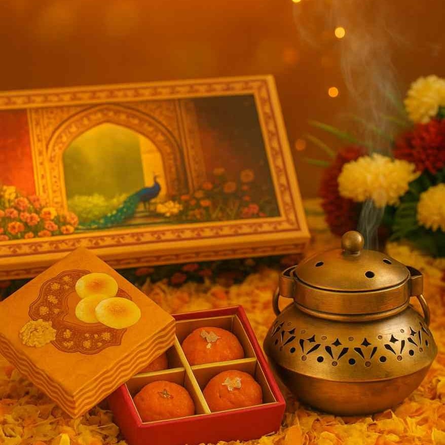 Introducing our versatile Diwali gift hamper including amazing Diwali theme gifts. Combo includes mini T-Light Lantern, suitable for both incense and tea candles along with pack of 4 motichoor laddoo candles all packed beautifully in gold foil printed box. Best Diwali decorative item, gifts for Diwali for relatives, family, friends and corporate Diwali gift.