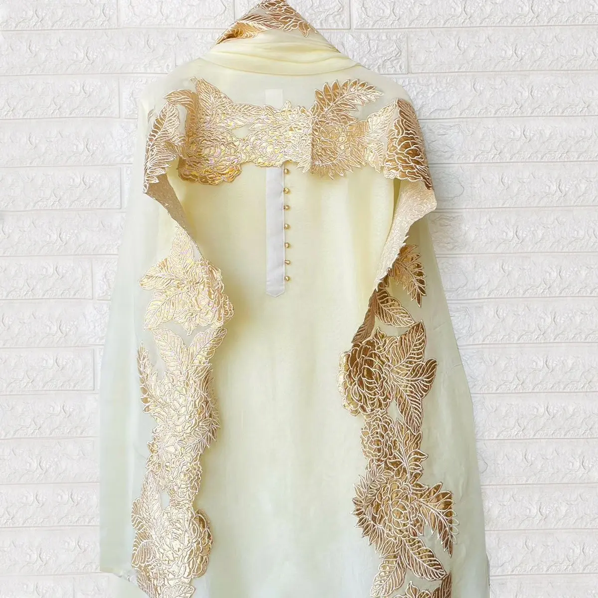 Crafted from premium organza silk material, this suit is designed with beautiful cushioning golden cutwork design. Complete the set with shantoon bottoms and organza dupatta, this is a beautiful unstitched suit that allows for customization and styling according to your preferences, ensuring a personalized touch to your look.