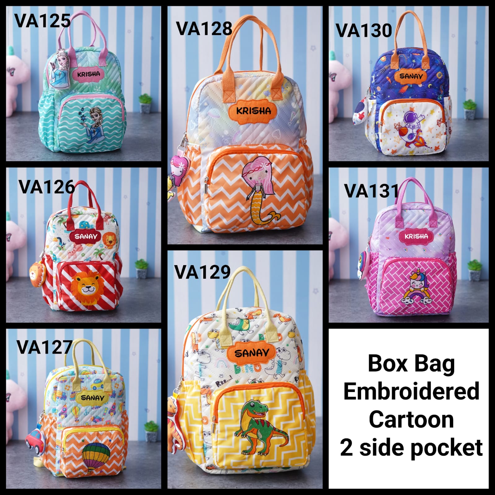 Step into a magical world with our attractive kids printed bag ! Customized with your child’s name, it includes a cute 3D keychain toy and an embroidered character patch on the front pocket. It’s spacious in size with 2 zippers and side pockets for convenience. Includes 2 types of handles- one for carrying with hands and one at back to carry at shoulders. You can add set of attractive cartoon pencils, Veigo large lunch box with small vegetable box, cutlery and sipper bottle all personalized with your name.